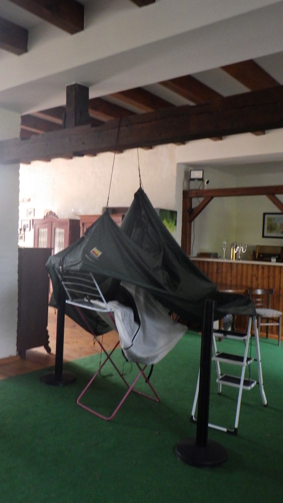 Auf der Suche nach einem biwakplatz habe ich Karoline getroffen, die auch mit dem Rad alleine für 1 Woche unterwegs war. Wir haben dann zusammen auf dem Platz übernachtet. Auch mal schön Gesellschaft zu haben. Als wir morgens aufgewacht sind hat es immer noch sehr stark geregnet. Sie ist weiter gefahren und da ich auch noch eine SMS wegen Überschwemmungsgefahr bekommen habe, habe ich mich entschlossen mir ein Hotelzimmer zu gönnen. Da war ich auch echt im siebten Himmel und mein Zelt konnte in der Zeit trocknen.